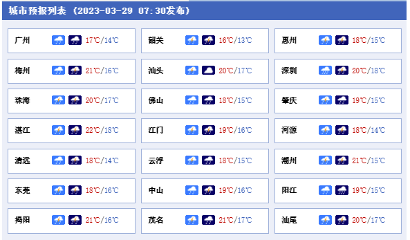 今天夜間至明天,珠江三角洲、茂名、陽江、河源等市縣有大雨局部暴雨,其余市縣陰天間多云,有中雨局部大雨。明天早晨最低氣溫:粵北和粵東市縣13℃~16℃,雷州半島市縣19℃~22℃,其余市縣16℃~19℃。