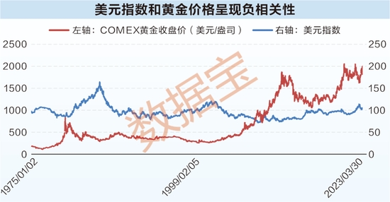 1971年~1980年間,布雷頓森林體系解體后,美元不再和黃金掛鉤,美元指數(shù)經(jīng)歷了一段下行周期,而黃金迎來(lái)第一輪大牛市。2000年互聯(lián)網(wǎng)泡沫破碎,美聯(lián)儲(chǔ)在2000年末開(kāi)啟長(zhǎng)達(dá)2年多的降息周期,黃金進(jìn)入第二輪大牛市。
