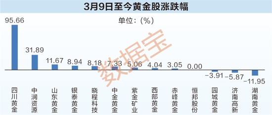 在金價(jià)狂飆的帶動(dòng)下,A股黃金上市公司迎來(lái)一波大漲。證券時(shí)報(bào)·數(shù)據(jù)寶統(tǒng)計(jì),3月9日至今,四川黃金大漲95.66%,該股為3月“最牛新股”之一,錄得上市20個(gè)交易日14漲停戰(zhàn)績(jī);中潤(rùn)資源期間收獲5連板,累計(jì)漲幅31.89%;山東黃金、銀泰黃金、曉程科技等一眾黃金股漲逾8%。