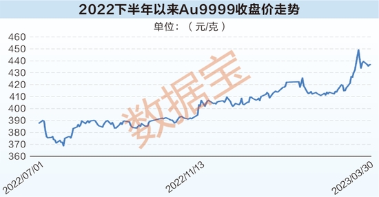 國(guó)內(nèi)黃金ETF的主要跟蹤標(biāo)的是上海黃金交易所的Au9999黃金現(xiàn)貨價(jià)格。今年以來(lái),Au9999黃金現(xiàn)貨價(jià)格震蕩走高,累計(jì)上漲6.5%,3月20日向450元/克關(guān)口發(fā)起沖擊,最新收盤(pán)價(jià)437.19元/克。