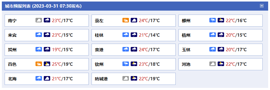 今天白天到今天晚上,全區(qū)陰天大部有陣雨或雷雨,其中梧州、玉林、貴港、欽州等市局地有中到大雨。桂東、桂南局地有能見(jiàn)度不足1千米的霧或輕度回南潮濕天氣。