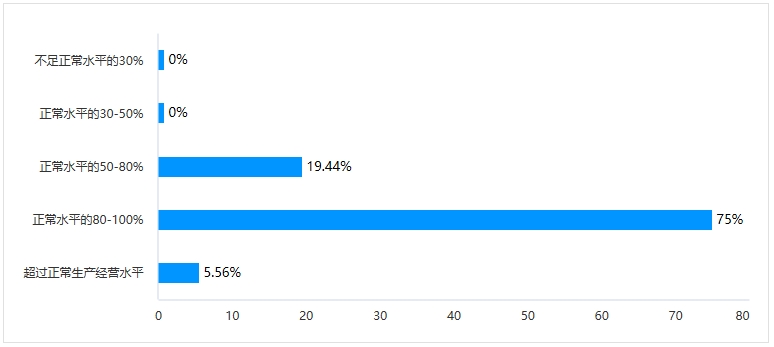 選擇不足正常水平的30%的,無;選擇正常水平的30-50%的,無;選擇恢復(fù)到正常水平的50-80%的為7家,占比為19.44%;選擇恢復(fù)到正常水平的80-100%的為27家,占比為75%;選擇超過正常生產(chǎn)經(jīng)營水平的為2家,占比為5.56%。