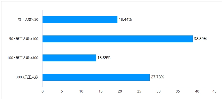 500萬元≤年銷售額<2000萬元的為 5家,占比為13.89%;2000萬元≤年銷售額<1億元的為14家,占比為38.89%;1億元≤年銷售額<3億元的為13家,占比為36.11%;年銷售額≥3億元的為4家,占比為11.11%。