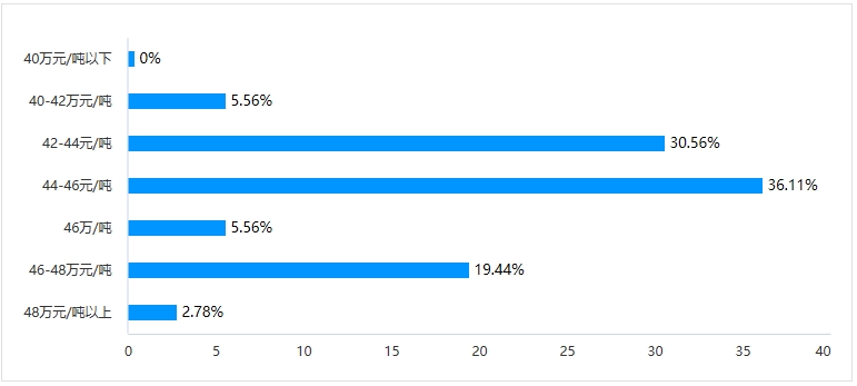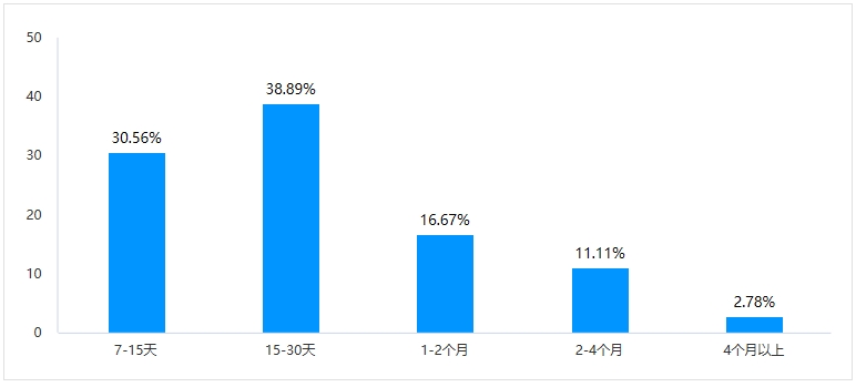 選擇7-15天的為11家,占比為30.56%;選擇15-30天的為14家,占比為38.89%;選擇1-2個(gè)月的為6家,占比為16.67%;選擇2-4個(gè)月的為4家,占比為11.11%;選擇4個(gè)月以上的為1家,占比為2.78%。