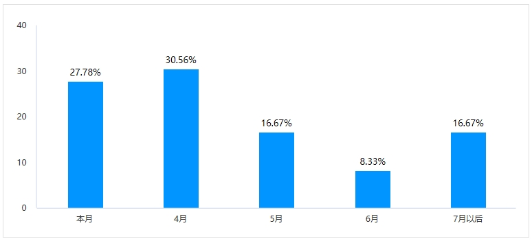 選擇訂單到3月的為10 家,占比27.78%;選擇訂單到4月的為11家,占比為 30.56%;選擇訂單到5月的為6家,占比為16.67%;選擇訂單到6月的為3家,占比為8.33%;選擇訂單到7月以后的為6家,占比為16.67%。