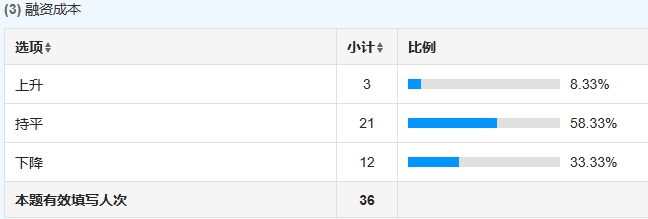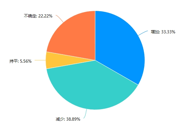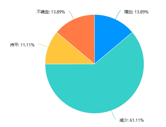 選擇增加的為5 家,占比為13.89%;選擇減少的為22家,占比為61.11%;選擇持平的為4 家,占比為11.11%;選擇不確定的為5家,占比為13.89%。