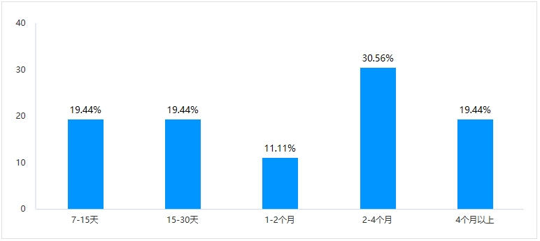 選擇7-15天的為7家,占比為19.44%;選擇15-30天的為7家,占比為19.44%;選擇1-2個(gè)月的為4家,占比為11.11%;選擇2-4個(gè)月的為11家,占比為30.56%;選擇4個(gè)月以上的為7家,占比為19.44%。