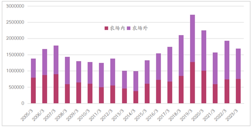 玉米庫存低于預(yù)期,小麥庫存高于預(yù)期。報告顯示,截至2023年3月1日,美玉米舊作庫存74.006億蒲式耳,低于預(yù)期的74.7億蒲式耳,較去年同期的78.5億蒲式耳減少5.7%;截至2023年3月1日,美小麥舊作庫存9.46億蒲式耳,高于預(yù)期的9.34億蒲式耳,較去年同期的10.25億蒲式耳減少8.9%。從數(shù)據(jù)推測,美玉米一季度表觀消費量為34.2億蒲式耳,同比減少11.9%;美麥一季度表觀消費量為3.66億蒲式耳,同比增加5%。在對比美豆、玉米、小麥的季度報告結(jié)果后不難發(fā)現(xiàn),季度庫存報告中美豆供應(yīng)緊張的預(yù)期是最明確的,這也是美豆系品種強勢上行的原因。美玉米因第一季度中國采購需求減少,其舊作庫存同比下降有限。美麥舊作庫存9.46億蒲式耳,較去年同期的10.25億蒲式耳減少8.9%,這說明俄烏沖突導(dǎo)致的全球小麥?zhǔn)袌龀隹诟窬肿兓瘜γ利湹南M還是起到了利好的作用。