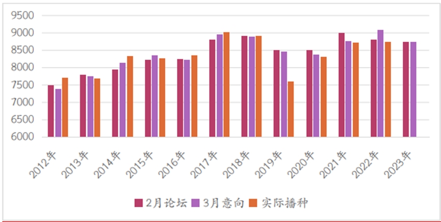 雖然2023年報告預(yù)期農(nóng)作物播種面積整體增加,但是以細(xì)分品種為單位的各作物面積增減不一,整體呈現(xiàn)“谷物增、油料持平、經(jīng)濟(jì)作物面積下降”的局面。具體來看,美玉米播種面積預(yù)計9199.6萬英畝,高于路透的9088萬英畝、2月論壇展望的9100萬英畝及2022年實際播種面積8860萬英畝;美麥播種面積預(yù)計4986萬英畝,高于路透的4885.2萬英畝、2月論壇展望的4950萬英畝及2022年實際播種面積4570萬英畝;美豆播種面積預(yù)計8751萬英畝,低于路透的8824.2萬英畝,基本持平于2月論壇展望的8750萬英畝,略高于2022年實際播種面積8745萬英畝;棉花(14320, -25.00, -0.17%)播種面積預(yù)計1130萬英畝,高于路透的1121.1萬英畝和2月論壇展望的1090萬英畝,但低于2022年實際播種面積1380萬英畝。