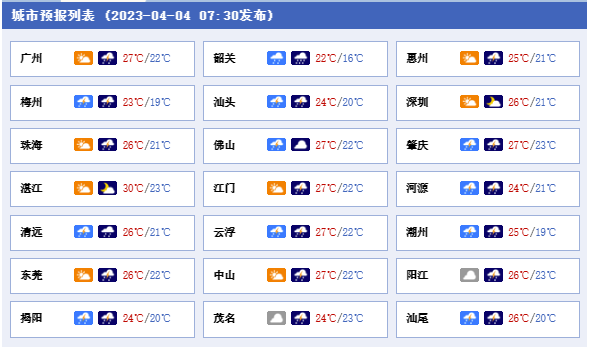 具體預(yù)報(bào):3日-4日白天,韶關(guān)、清遠(yuǎn)、肇慶有雷陣雨局部大雨或暴雨,其余市縣多云間陰天有分散(雷)陣雨,早晚有輕霧。早晨最低氣溫:粵西、珠三角市縣 22℃~25℃,其余市縣 18℃~21℃。