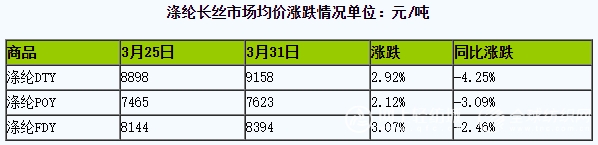 根據(jù)生意社監(jiān)測顯示,上周(3月25-31日)維持小幅上行,其中,滌綸FDY上漲3.07%,POY上漲2.12%,滌綸DTY上漲2.92%。目前,江浙地區(qū)主流滌綸長絲工廠,滌綸POY(150D/48F)報價在7550-7750元/噸,滌綸DTY(150D/48F低彈)報價在8900-9500元/噸,滌綸FDY(150D/96F)報價在8300-8500元/噸。
