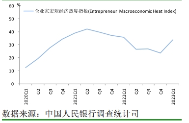 日前,中國人民銀行發(fā)布的2023年第一季度企業(yè)家問卷調(diào)查結(jié)果顯示,一季度中國企業(yè)家宏觀經(jīng)濟(jì)熱度指數(shù)為33.8%,比上季度上升10.3個(gè)百分點(diǎn),比上年同期下降1.9個(gè)百分點(diǎn)。其中,33.9%的企業(yè)家認(rèn)為宏觀經(jīng)濟(jì)“偏冷”,64.6%認(rèn)為“正?!?,1.5%認(rèn)為“偏熱”。