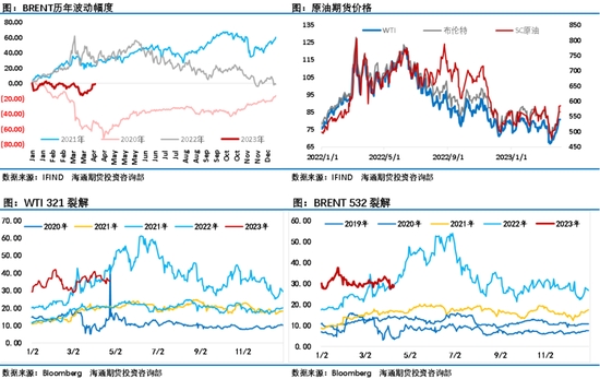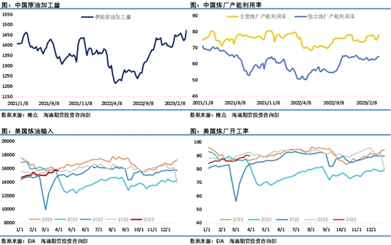 需求方面,4月第一周中國原油加工量再次刷新2年來新高,據(jù)航班管家數(shù)據(jù),2023年3月,全球民航客運航班恢復至2019年同期的88.1%。中國三大航司的恢復率(當期航班量/2019年同期航班量)明顯提升。其中,國航已超2019年同期,恢復率達100.6%。三亞、廣州、成都、杭州等多個城市的一季度機票預訂量已超過2019年同期;EIA數(shù)據(jù)也顯示美國市場表需反彈明顯,尤其是前期表現(xiàn)疲軟的柴油消費也有明顯反彈。但是近期急漲的油價壓縮了成品油裂解差,顯然下游消費端對高油價的接受度較低,這或許會影響后續(xù)需求端的表現(xiàn)。