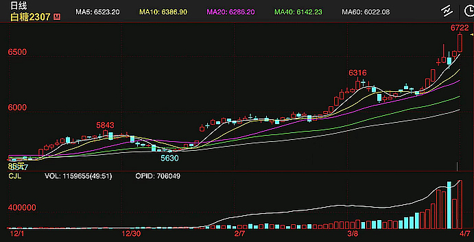 3月29日,白糖期貨價(jià)格從6200元/噸,經(jīng)歷8個(gè)交易日累計(jì)漲7.6%,至4月7日夜盤收盤,收于6750元/噸,期貨價(jià)格創(chuàng)出6年來(lái)新高。