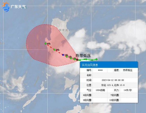 另外,4月11日14時(shí),原位于菲律賓東部的熱帶云團(tuán)發(fā)展為熱帶低壓,12日上午8時(shí),其中心位于北緯13.8度,東經(jīng)123.4度,也就是在菲律賓馬尼拉偏東南方向約275公里的菲律賓島上,中心附近最大風(fēng)力7級(jí),達(dá)到14米每秒,中心最低氣壓1004百帕。預(yù)計(jì),未來24小時(shí)熱帶低壓將以每小時(shí)10公里左右的速度向西偏北方向移動(dòng),強(qiáng)度變化不大,對廣東無直接影響。