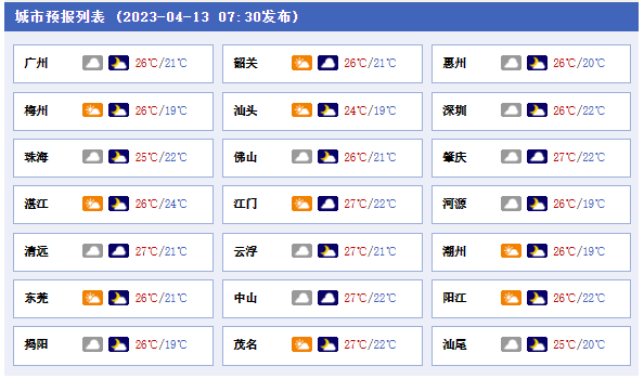 13日,粵北市縣陰天到多云有分散小雨,其余市縣多云間陰天局部小雨;部市縣早晚有(輕)霧。早晨最低氣溫:粵北、粵東市縣17℃~20℃,其余市縣21℃~23℃。