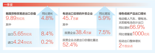 據(jù)海關(guān)統(tǒng)計(jì),一季度,我國(guó)貨物貿(mào)易進(jìn)出口總值9.89萬(wàn)億元,同比增長(zhǎng)4.8%。我國(guó)外貿(mào)開(kāi)局平穩(wěn),呈現(xiàn)逐月向好態(tài)勢(shì),進(jìn)出口增速逐月提升。海關(guān)總署新聞發(fā)言人、統(tǒng)計(jì)分析司司長(zhǎng)呂大良4月13日在國(guó)新辦新聞發(fā)布會(huì)上表示,盡管外部形勢(shì)嚴(yán)峻復(fù)雜,但我國(guó)外貿(mào)仍然展現(xiàn)出較強(qiáng)韌性。綜合研判,今年實(shí)現(xiàn)外貿(mào)促穩(wěn)提質(zhì)的目標(biāo)有支撐。