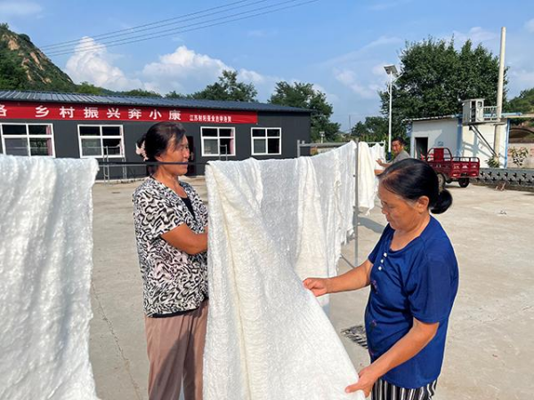 2019年8月,關(guān)莊鎮(zhèn)楊家坪村養(yǎng)蠶試點(diǎn)的成功,點(diǎn)燃了村民養(yǎng)蠶的熱情。通過(guò)楊家坪村集體經(jīng)濟(jì)聯(lián)合社與浙江錢皇網(wǎng)絡(luò)科技股份有限公司達(dá)成合作協(xié)議,共同建設(shè)集種桑、養(yǎng)蠶、剝繭、蠶絲被制作和銷售為一體的綜合性蠶桑養(yǎng)殖基地,公司先期出資20萬(wàn)元幫助楊家坪村修葺舊學(xué)校窯洞6孔作為蠶室和手工蠶絲被作坊,助力楊家坪村蠶桑產(chǎn)業(yè)快速發(fā)展。按照鮮繭35元/斤的市場(chǎng)價(jià)格計(jì)算,每戶平均收益5600元;如果將鮮繭打棉后可產(chǎn)蠶絲24斤,按照蠶絲360元/斤的價(jià)格計(jì)算,平均每戶收益8640元;如果將蠶絲加工成蠶絲被,每4斤蠶絲可加工1塊雙人蠶絲被,1塊雙人蠶絲被的售價(jià)可達(dá)2600元,6塊雙人蠶絲被的收入可達(dá)15600元。2022年,楊家坪村10戶養(yǎng)蠶戶每戶可增收11200元。