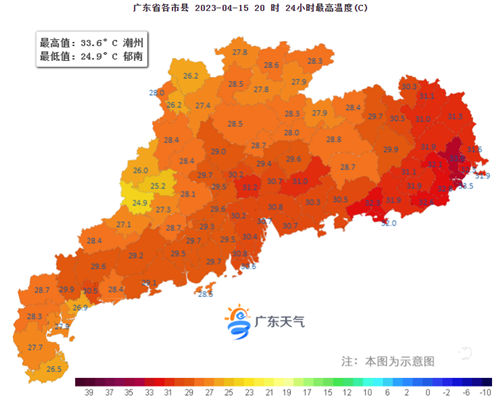 15日,我省大部晴到多云為主,午后出現(xiàn)了分散小雨。除了肇慶西部、云浮受云量較多影響最高溫度較14日下降1℃~3℃以外,我省大部的最高溫度較14日普遍上升,其中珠三角和粵東市縣上升了3℃~6℃,其中潮州錄得全省最高溫度33.6℃。