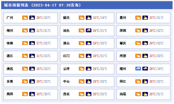 17日,我省西部市縣多云間陰天,有分散陣雨,東部市縣多云為主,有零星小雨。早晚有輕霧,部分市縣有霧。早晨最低氣溫:粵北的偏北市縣、肇慶北部地區(qū)17℃~20℃,其余市縣20℃~23℃。
