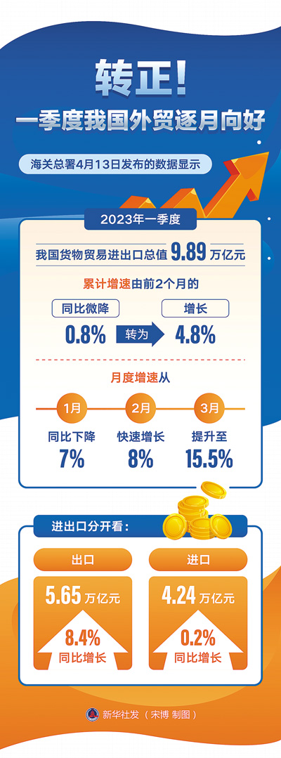 -7%、8%、15.5%,一季度3個(gè)月份,中國(guó)外貿(mào)跑出了進(jìn)出口增速的向上曲線,也跑出了復(fù)雜背景下全年保穩(wěn)提質(zhì)的篤定和信心。