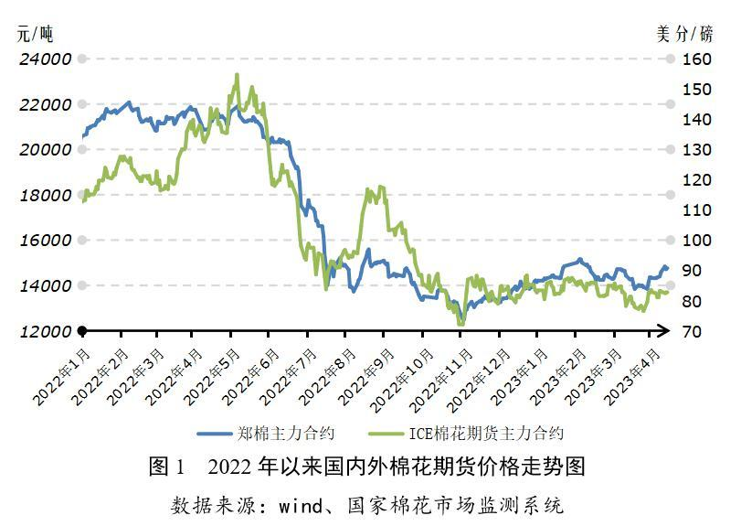 3月中旬以來,硅谷銀行資產(chǎn)被收購令市場對銀行業(yè)動蕩的擔憂逐漸緩解,“歐佩克+”集體減產(chǎn)令原油價格大幅走強,同時美元指數(shù)下跌也給棉花市場帶來一定支撐,國際棉價小幅下跌后反彈。截至2023年4月14日,ICE棉花期貨主力合約結算價82.93美分/磅,較3月中旬上漲4.76%;代表進口棉中國主港到岸均價的國際棉花指數(shù)(M)為96.07美分/磅,折1%關稅人民幣進口成本16014元/噸(不含港雜和運費),較3月中旬上漲3.24%。
