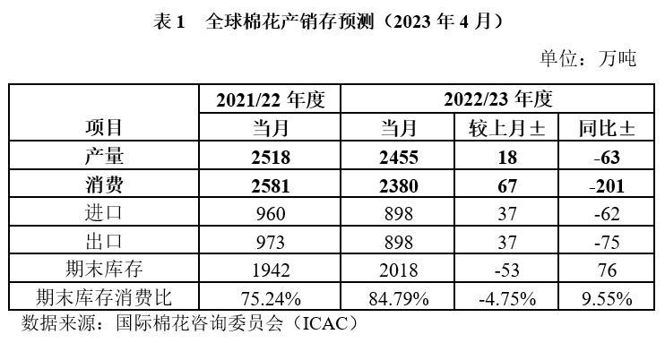 據(jù)國際棉花咨詢委員會(ICAC)4月份預測數(shù)據(jù),2022年度,全球棉花產(chǎn)量2455萬噸,環(huán)比調(diào)增0.74%,同比減幅2.5%;全球棉花消費量2380萬噸,環(huán)比調(diào)增2.90%,同比減幅7.8%,全球棉花產(chǎn)大于需75萬噸(中國以外國際市場棉花產(chǎn)大于需227萬噸)。分國家來看,美國、巴基斯坦、印度共減產(chǎn)105萬噸,中國、巴西共增產(chǎn)72萬噸;除中國外,大部分主要棉花消費國消費預期普遍萎縮,導致期末庫存消費比同比增加9.55個百分點至84.79%,僅次于2019年度時受中美貿(mào)易摩擦和疫情爆發(fā)雙重影響下95.96%的水平。