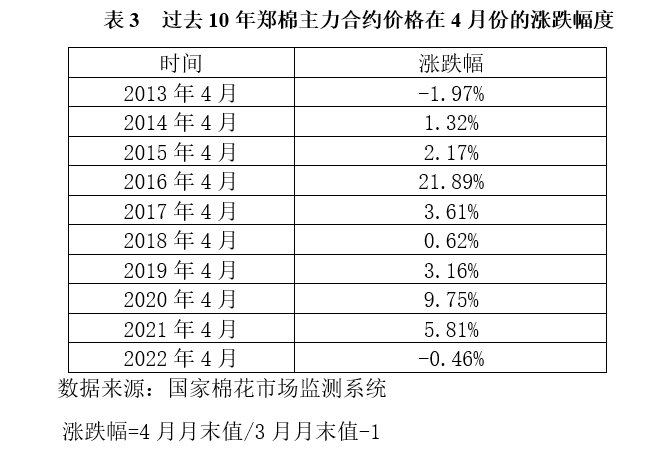 近期,北半球新年度棉花播種已陸續(xù)啟動,市場焦點向供應端轉(zhuǎn)移,主產(chǎn)區(qū)天氣及播種情況成為近期影響棉價的主要因素之一。從往年情況來看,春播期間棉花價格往往呈現(xiàn)上漲態(tài)勢,過去10年鄭棉主力合約結算價在4月當月平均漲幅為4.58%??紤]到季節(jié)性規(guī)律,預計春播期間棉價易漲難跌。
