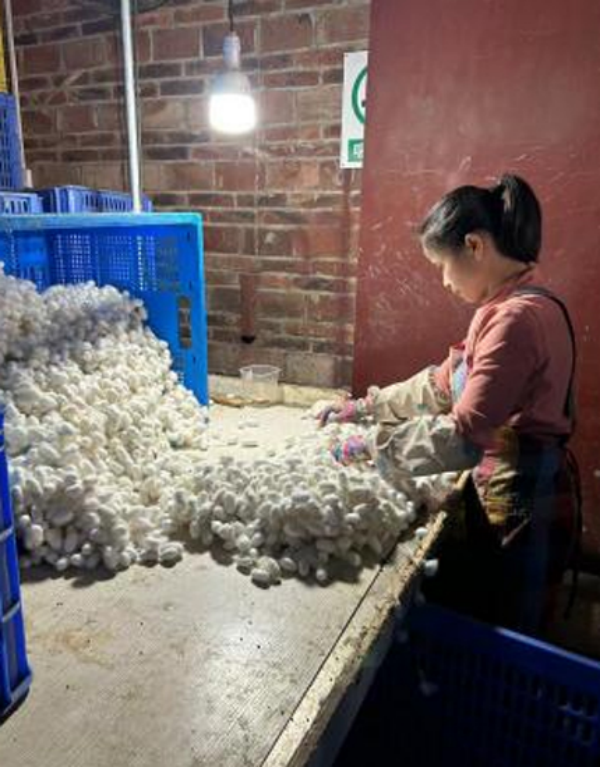 選繭車間進(jìn)行蠶繭分選工作及工人培訓(xùn)