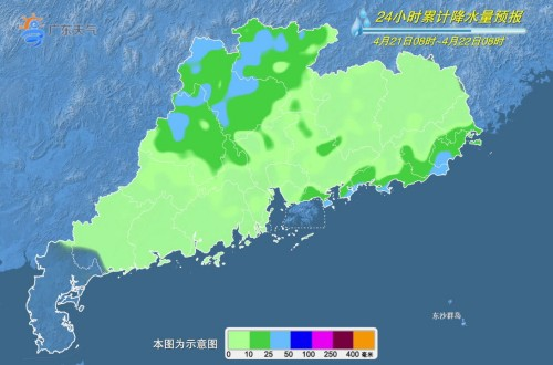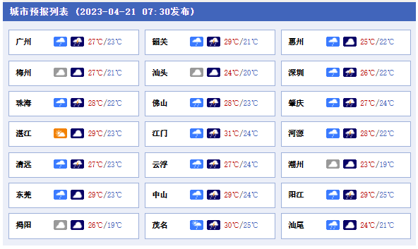 21日,粵西和珠三角多云間陰天,中(雷)雨,局部大雨或暴雨,其余市縣多云,有(雷)陣雨。大部分市縣早晚有輕霧。