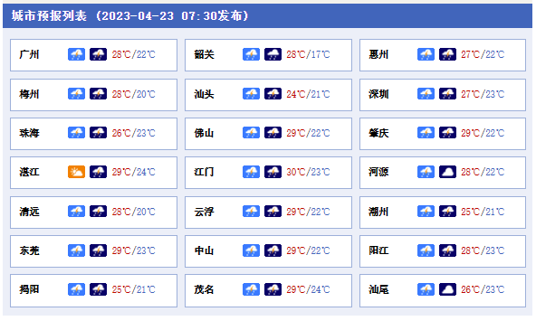 23-24日,韶關(guān)和清遠(yuǎn)有中到大雨,局部暴雨,粵西和珠三角西部市縣多云間陰天,有(雷)陣雨,其余市縣多云,局部有(雷)陣雨。24日白天粵北氣溫小幅下降。