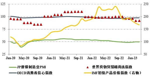 2023年以來,世界經(jīng)濟復(fù)蘇形勢更趨復(fù)雜,地緣沖突持續(xù)、通脹壓力猶存、加息周期延長等抑制因素持續(xù)存在,金融體系動蕩新增不確定性,需求側(cè)復(fù)蘇動能明顯不足,帶動供給端同步走弱。全球制造業(yè)景氣連續(xù)7個月處于收縮區(qū)間,3月J.P. Morgan制造業(yè)采購經(jīng)理指數(shù)(PMI)為49.6,較2月下降0.3個百分點,其中新出口訂單指數(shù)下降0.6個百分點至47.7。經(jīng)合組織(OECD)消費者信心指數(shù)為97.7,較2022年末回升0.7個百分點,但已連續(xù)18個月處于收縮區(qū)間。受航空運輸、港口吞吐不景氣等因素拖累,3月發(fā)布的WTO貨物貿(mào)易晴雨表指數(shù)為92.2,出口訂單指數(shù)為97.4,均低于100趨勢水平,表明一季度貿(mào)易増勢依舊疲軟。通脹水平保持高位回落態(tài)勢,3月IMF初級商品價格指數(shù)為167.4,較上年同期大幅回落71.3個百分點。