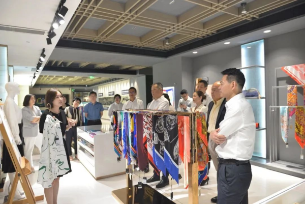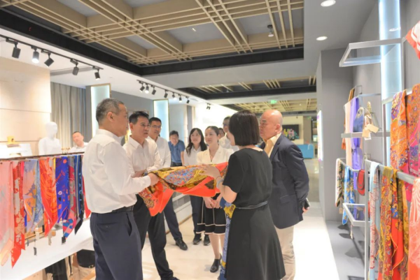 張國(guó)強(qiáng)對(duì)聞淵行長(zhǎng)一行的到訪表示熱烈歡迎。他表示,多年來(lái)集團(tuán)與杭州聯(lián)合銀行合作緊密,對(duì)杭州聯(lián)合銀行一直以來(lái)給予的支持表示感謝。隨后,張國(guó)強(qiáng)邀請(qǐng)聞淵行長(zhǎng)一行前往集團(tuán)本部二樓的展廳進(jìn)行參觀,并就集團(tuán)歷史沿革、產(chǎn)業(yè)鏈布局及特色產(chǎn)品等進(jìn)行了詳細(xì)介紹。參觀期間,聞淵行長(zhǎng)一行對(duì)凱喜雅絲綢產(chǎn)品贊不絕口,對(duì)集團(tuán)的技術(shù)優(yōu)勢(shì)和市場(chǎng)前景表現(xiàn)出了濃厚興趣。