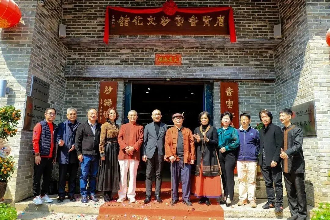 揭牌儀式進行時,陽光明媚,十二位揭牌嘉賓徐徐拉開帷幕,“唐賢香云紗文化館”金字招牌,以及“香云紅袖添神韻”“紗縵伊人吟古風”的對聯(lián)在陽光與彩帶的映襯下,神韻盡現(xiàn),古風繼長。