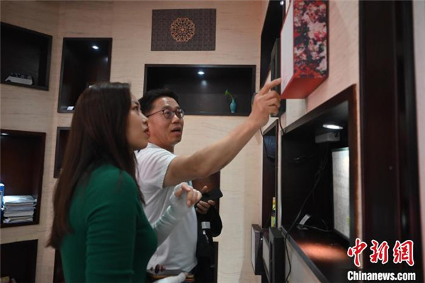 圖為南恩鎬(右一男性)正在給“行走中國·2023海外華文媒體高層川渝行”參訪團嘉賓介紹夏布產(chǎn)品