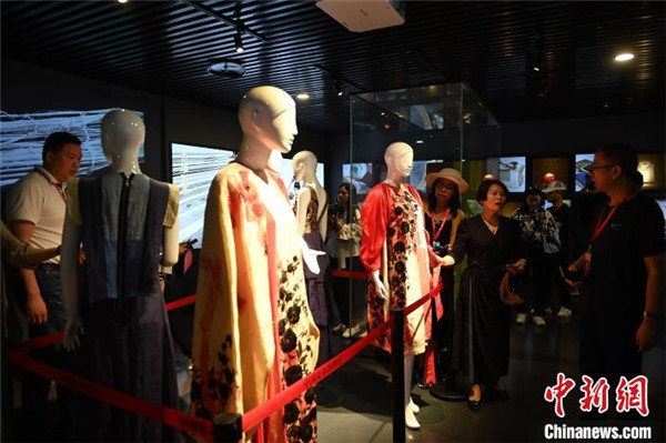 圖為“行走中國·2023海外華文媒體高層川渝行”參訪團嘉賓正在觀賞夏布制作的服飾
