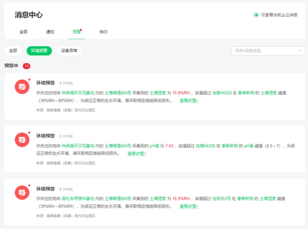 “您關(guān)注的種養(yǎng)殖循環(huán)示范基地內(nèi)6號地塊,土壤溫度為15.9%RH,該值超過閾值30%RH,為保證正長生長,請采取措施降低損失,”在幾公里外的工作人員收到系統(tǒng)發(fā)來的預(yù)警信息,可以實(shí)時(shí)做出科學(xué)決策,遠(yuǎn)程操作進(jìn)行灌溉、打藥。新型職業(yè)農(nóng)民一個(gè)人可以管理幾百、千畝的數(shù)字農(nóng)田,一改面朝黃土背朝天的勞苦形象。