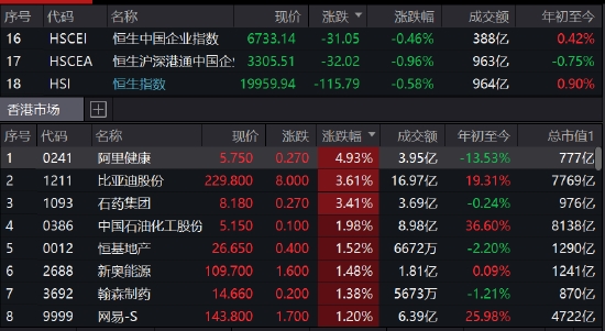 港股上周五受科技股拖累下,恒指一度失守20,000點關口,不過收市仍下跌超321點,收報20,075點,科指更在成份股全數(shù)下跌的情況下,失守4,000點關口,全日計下跌3.1%。今日早盤,港股恒指低開低走,午后恒指大幅拉升,截至收盤,恒指跌0.58%,報19959.94點,阿里健康(5.75, 0.27, 4.93%)漲近5%,比亞迪(229.8, 8.00, 3.61%)股份漲3.6%,石藥集團(8.18, 0.27, 3.41%)漲3.4%。