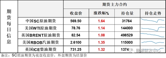 【1】WTI主力原油期貨收跌1.87美元,跌幅2.36%,報77.37美元/桶;布倫特主力原油期貨收跌2.02美元,跌幅2.43%,報81.1美元/桶;INE原油期貨收跌2.29%,報558.7元。