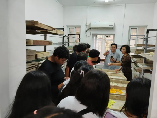 隨后,來(lái)訪師生走進(jìn)蠶培中心養(yǎng)蠶實(shí)驗(yàn)室,了解不同的蠶品種和用途,觀看不同發(fā)育階段的蠶幼蟲和多色蠶繭展示標(biāo)本,近距離接觸可愛的蠶寶寶,學(xué)習(xí)了蠶從孵化到結(jié)繭、產(chǎn)卵整個(gè)生命周期的生長(zhǎng)發(fā)育過程。蠶培中心的王葉元副教授還向來(lái)訪師生介紹室內(nèi)燈光養(yǎng)蠶技術(shù),二氧化氯空氣凈化消毒設(shè)備,智慧養(yǎng)蠶設(shè)施等養(yǎng)蠶設(shè)施設(shè)備。同學(xué)們紛紛表示,希望有機(jī)會(huì)來(lái)華南農(nóng)業(yè)大學(xué)學(xué)習(xí)蠶桑技術(shù),推動(dòng)蠶絲業(yè)在厄瓜多爾的發(fā)展。最后,劉吉平給來(lái)訪師生作中國(guó)蠶桑文化專題報(bào)告,帶領(lǐng)師生們領(lǐng)略中國(guó)悠久豐富的蠶桑文化。