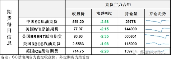 【1】WTI主力原油期貨收跌1.69美元,跌幅2.15%,報77.07美元/桶;布倫特主力原油期貨收跌1.94美元,跌幅2.35%,報80.6美元/桶;INE原油期貨收跌2.58%,報551.2元。