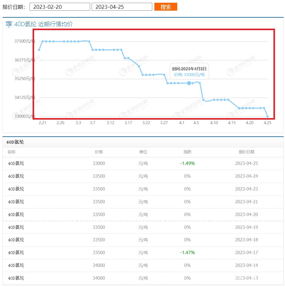 原油價(jià)格的不斷上漲,帶動(dòng)了一批紡織原料價(jià)格的上漲,但氨綸價(jià)格卻不增反跌,2月20日以來(lái),氨綸絲(以40D為例)價(jià)格下降已有4500元/噸,氨綸價(jià)格不斷進(jìn)入下探模式。