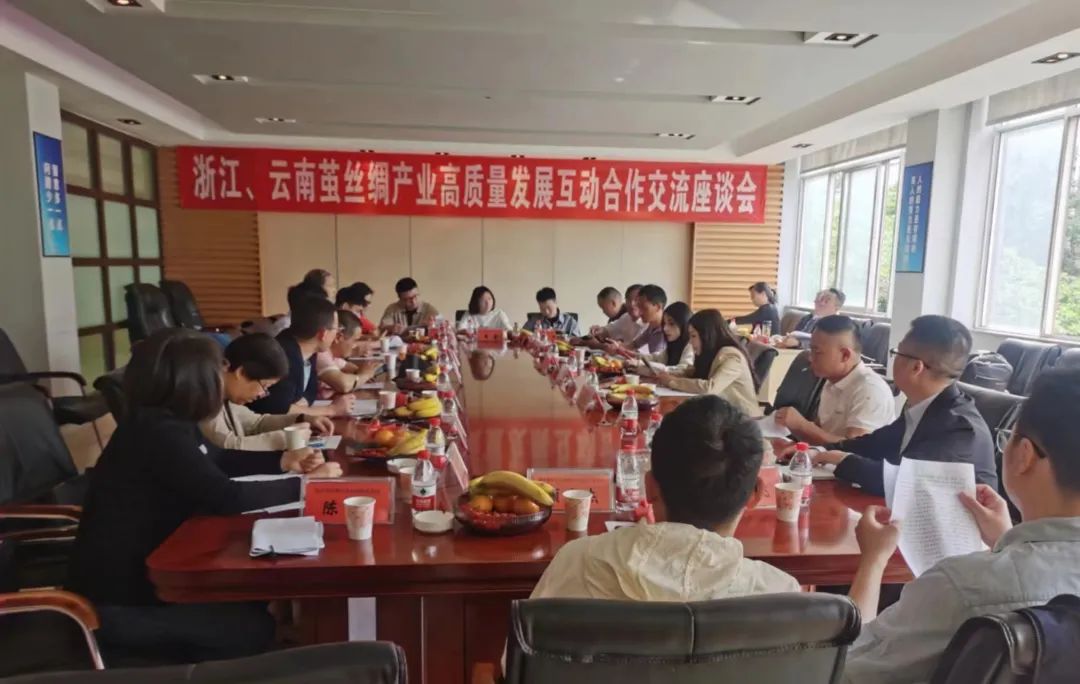 在云南新千佛繭絲綢有限公司內(nèi),進(jìn)行了浙江、云南兩省繭絲綢產(chǎn)業(yè)高質(zhì)量發(fā)展互動(dòng)合作交流座談會(huì)。