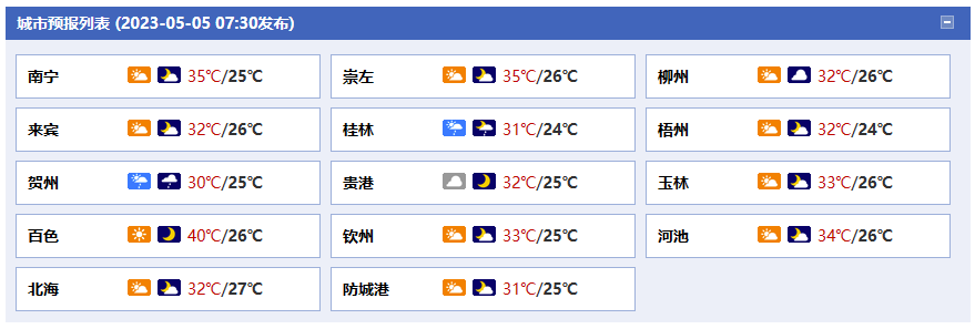 南寧市:今天白天到晚上,多云,偏南風(fēng)2~3級(jí),局地陣風(fēng)6~7級(jí),最高氣溫35℃,最低氣溫25℃。