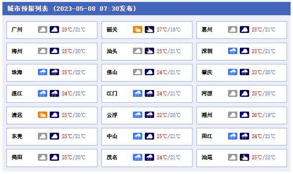 8日,南部市縣陣雨轉(zhuǎn)多云,其余市縣多云為主局部陣雨。早晨最低氣溫:粵北17℃~20℃,雷州半島23℃~25℃,其余市縣21℃~23℃。