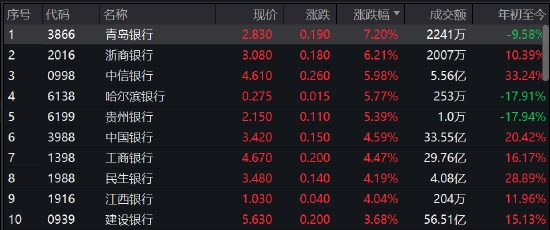 銀行股集體爆發(fā),青島銀行(2.83, 0.19, 7.20%)漲7.2%,浙商銀行(3.08, 0.18, 6.21%)漲6.2%,中信銀行(4.61, 0.26, 5.98%)漲近6%,中國(guó)銀行(3.42, 0.15, 4.59%)、工商銀行(4.67, 0.20, 4.47%)等漲超4%,分析人士認(rèn)為,主要銀行主要有三大驅(qū)動(dòng)力存在:一是即使經(jīng)過(guò)今天的大漲,很多股票的股息率依然在6%左右,市盈率和市凈率也依然偏低;二是在經(jīng)濟(jì)預(yù)期偏弱的背景之下,國(guó)債市場(chǎng)表現(xiàn)很好,這有利于紅利板塊的表現(xiàn);三是關(guān)于有中國(guó)特色的估值體系明顯利好銀行。