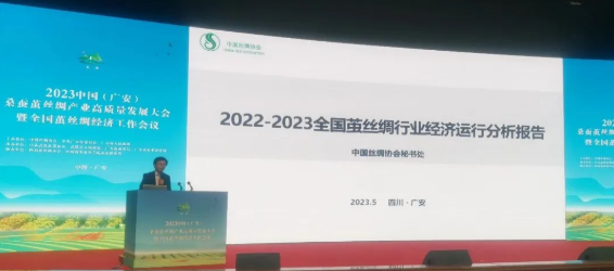 中國(guó)絲綢協(xié)會(huì)秘書長(zhǎng)劉文全在在2023中國(guó)(廣安)桑蠶繭絲綢產(chǎn)業(yè)高質(zhì)量發(fā)展大會(huì)暨全國(guó)繭絲綢經(jīng)濟(jì)工作會(huì)議上作《2022-2023年全國(guó)繭絲綢行業(yè)經(jīng)濟(jì)運(yùn)行分析報(bào)告》。