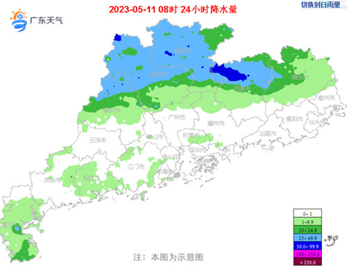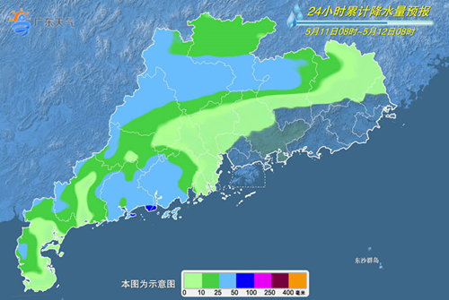 具體預報:11日,湛江、茂名、清遠、韶關、河源有中到大雨局部暴雨,其余市縣陰天間多云,有分散小雨。