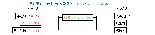 上周(2023年5月8—12日),下游需求跟進一般,原料端變化不大,錦綸長絲窄幅下滑。供應(yīng)端來看,錦綸行業(yè)開工維持穩(wěn)定,貨源供應(yīng)量充足;從下游來看,下游及終端領(lǐng)域需求跟進良好,但整體市場仍處于供大于求狀態(tài),下游需求仍觀望心態(tài)居多,雖然已經(jīng)進入傳統(tǒng)旺季,但需求仍不如預(yù)期,按需跟進為主。