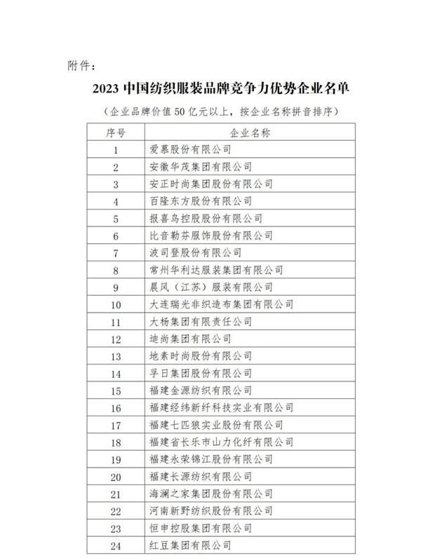 論壇上發(fā)布的“2023中國紡織服裝品牌競爭力優(yōu)勢企業(yè)”(名單后附),無一不是其中的杰出代表。中國紡織工業(yè)聯(lián)合會副會長楊兆華在現(xiàn)場介紹說,通過系統(tǒng)評估,共80家企業(yè)品牌價值超過50億元,確定為“2023中國紡織服裝品牌競爭力優(yōu)勢企業(yè)”。